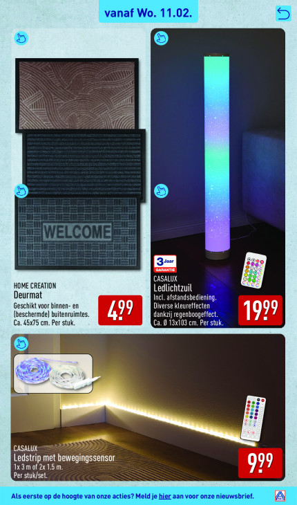 Deze tekst wordt automatisch gegenereerd, dus deze kan fouten bevatten.AN CC 2 CASALUX HOME CREATION Ledlichtzuil Deurmat Incl. afstandsbediening. Geschikt voor binnen- en Diverse kleureffecten , ) 5 7 (beschermde) buitenruimtes L = dankzij regenboogeffect. | 7 Ca. 45x75 cm. Per stuk. Ca. 0 13x103 cm. Per stuk. N ft >) VA DIS CASA u ES m D. PET US LL Per stuk/set. = |