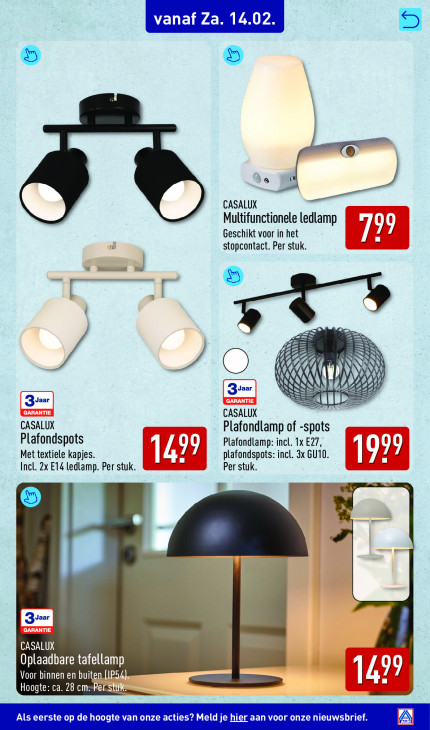 Deze tekst wordt automatisch gegenereerd, dus deze kan fouten bevatten.CASALUX Multifunctionele ledlamp Geschikt voor in het 12: stopcontact. Per stuk. u... u À VA 0 7 Ÿ SN N N JO ! 4 f N N „ W Sex N N N 22 LLC d 9 p Y & Zyaar 2 CASALUX CASALUX Plafondlamp of -spo t Plafondspots a | Plafondlamp: incl. 1x E27, Met textiele kapjes. 14 = plafondspots: incl. 3x GU10. 1999 Incl. 2x E14 ledlamp. Per stuk. Per stuk. er CASALUX Oplaadbare tafellamp 1 Voor binnen en buiten 14 um Hoogte: ca. 28 c IB Un Als eerste op de hoogte van onze acti 2 Meld je hier aan voor onze nieuws