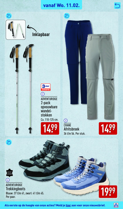 Deze tekst wordt automatisch gegenereerd, dus deze kan fouten bevatten.vanaf Wo. 11.02. ne Inklapbaar | ; 4 © ADVENTURIDGE 2-pack opvouwbare wandel- stokken Ca. 110-125 cm ® CRANE Afritsbroek 99 3 [79 [ RL 36 t/m 56. Per stuk. 14 Kij & Sa DS Ti Jas ADVENTURIDGE Trekkingboots Blauw: 37 t/m 41, zwart: 41 t/m 45 Per paar. Als eerste op de hoogte van onze acties? Meld je hier aan voor onze nieuwsbrief. A