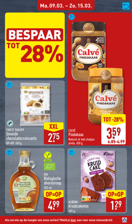 Deze tekst wordt automatisch gegenereerd, dus deze kan fouten bevatten.Ma. 09.03. - Zo. 15.03. ESP AAR À IE JOAO ú ERBEN, Calve) | TOT 8% À PINDAKAAS Q LE LS XXL KALK ROISSANTS & Calvé} ( PINDAKAAS BG a 5 % al TOT -28% XXL FINEST BAKERY CALVÉ Gevulde Pindakaas chocoladecroissants 213 Naturel of met stukjes OP=0P. 450 g. pinda. 650 g. Oo 4 5 DN nt „> seit VOOR VID \ AKE FS BIO Esser ornsiroop. Biologische ornsirup p DÉrable ahornsiroop BO) voe OP oP 0P-0P } sove ALBONA u Kruidcakemix 29 nn — 19 CIRE Als eerste op de hoogte van onze acties? Meld je hier aan voor onze nieuwsbrief.