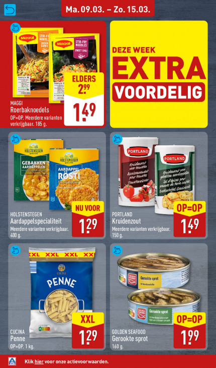 Deze tekst wordt automatisch gegenereerd, dus deze kan fouten bevatten.Ma. 09.03 - Zo. 15.03 NOODLE) HICKEN STIR-FRY LINSE N ET CHILI DEZE WEEK ie % Pr n ELDERS EXTRA 2” 1 VOORDELIG LA Roerbaknoedels OP=OP. Meerdere varianten 14? verkrijgbaar. 185 g HOLSTENSEGEN Hol I GEN GEBAKKEN] N Kruidenzout pris AARDAPPELEN CT) PG 2 e PI (7 es Pd u a Jel lele 11770) % ve Den 5 2 4 ET à Li a | NU VOOR OP oP HOLSTENSTEGEN PORTLAND Aardappelspecialiteit Kruidenzout 29 Meerdere varianten verkrijgbaar. Meerdere varianten verkrijgbaar. 149 AK EN En cr bre. D 3) \ Gerookte sprot QENNE in koolzaadolie ASS lie > N = 9 CT Gerookte sprot DETTE 2 B XXL rss OP oP hen GOLDEN SEAFOOD Penne Be Ih] 99 OS OP=OP. 1 kg EN Klik hier voor onze actievoorwaarden