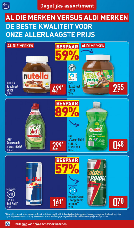 Deze tekst wordt automatisch gegenereerd, dus deze kan fouten bevatten.5 DE BESTE KWALITEIT VOOR ONZE ALLERLAAGSTE PRIJS Bo EE FAIRTRADE pasta, js EX | AOF NUTELLA el Hazelnoot pasta 600q ar AN N f ultra classic INA \ Quickwash afwasmiddel IN 350 ml DR Furl Kl DRINK 1:70) PTE >14 RED BULL U! LEUR Het vergelijk is gemaakt tussen huismerk en A-merk producten te koop bij ALDI. De A-merk prijzen zijn teruggerekend naar de grammages van de huismerk producten. Prijzen zijn gemeten op 09-02-2026. Kijk voor meer informatie op aldi.nl/vergelijk “Er geldt maximaal 4 dezelfde aanbiedingen per klant per bezo