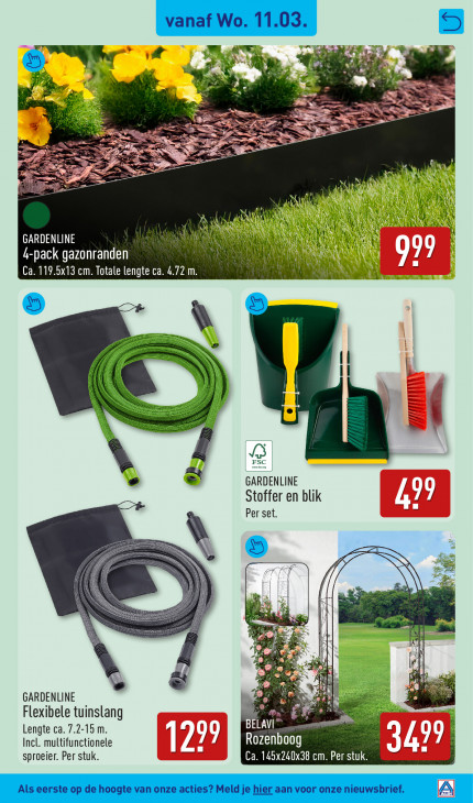 Deze tekst wordt automatisch gegenereerd, dus deze kan fouten bevatten.vanaf Wo. 11.03. = TE a « ba CRC + SN At ee a x SS ra et JN \ St GARDENLINE 4-pack gazonranden LER) Ca. 119.5x13 cm. Totale lengte ca. 4.72 m. A | = 1 | 1 | > FSC \ , GARD ENLINE Stoffer en blik 49 Per set. Be Fn Er N! el, | Ad GARDENLINE + Flexibele tuinslang E Lengte ca. 7.2-15 m. BELA Incl. multifunctionele Rozenboog RE sproeier. Per stuk. Ca. 145x240x38 cm. Per stuk. Als eerste op de hoogte van onze acties? Meld je hier aan voor onze nieuwsbrief. Al
