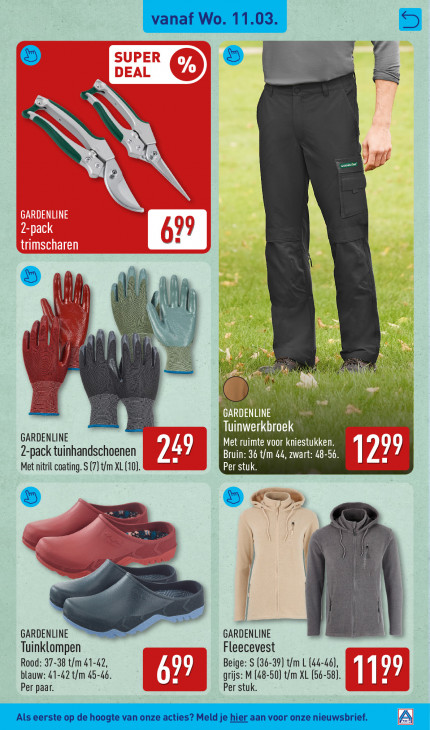 Deze tekst wordt automatisch gegenereerd, dus deze kan fouten bevatten.É ES à s 2 # | ii | 1 © 4 Ih FL he dl IN N ù G AN M Tuinwerkbroek GARDENLINE Met ruimte voor kniestukken. 2-pack tuinhandschoenen ms 11%] Bruin: 36 t/m 44, zwart: 48-56. | a 71717 Met nitril coating. S (7) t/m XL (10). Te Dun PE | er ‘ Ad N GARDENLINE GARDENLINE Tuinklompen Fleecevest Rood: 37-38 t/m 41-42, 71 Beige: S (36-39) t/m L (44-46), blauw: 41-42 t/m 45-46. u grijs: M (48-50) t/m XL (56-58). | | El Per paar. Per stuk. _Alseersteop de hoogte van onze actes? Meldje hier aan voor onze nieuwsbriet. ZN