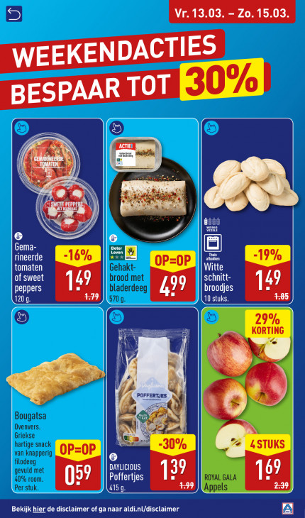 Deze tekst wordt automatisch gegenereerd, dus deze kan fouten bevatten.Vr. 13.03. - Zo. 15.03. WEEKENDACTIES BESPAA R TOT Sn "AA 14 EON 7 EN 7 Ata be rw jee CES »/ EEE WEINIG fd VEZELS & Gema- Beter Thuis tage tomaten Gehakt Witte of sweet brood met schnitt- 49 EEE 1: bladerdeeg broodjes 5709. 4 10 stuks ex: À iv 5 ii PO ES (3 Z Bougatsa il Ovenvers. à Griekse hartige snack van knapperig Co filodeeg DATE) 40% room. gevuld met Poffertjes 1: ib, Per stuk. 415 g Bekijk hier de disclaimer of ga naar aldi.nl/disclaimer A