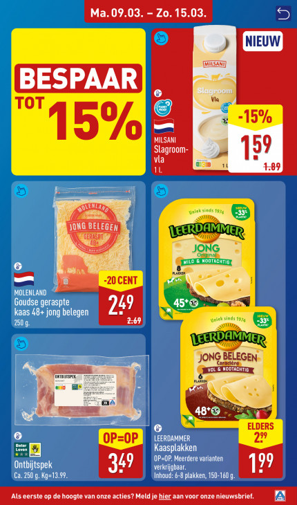 Deze tekst wordt automatisch gegenereerd, dus deze kan fouten bevatten.Ma. 09.03. - Zo. bi > MEUW ESP AAR Va KEE = -1 9% TOT 5%, MENT 59 VLa Slagroom- 21 TL 1L UP] 4 SS JONG BEL MELUN rw RR en (L SEN pe 20 CENT MOLENLAND Goudse geraspte kaas 48+ jong belegen 250 g. in SU CN € JONG BELEGEN. Caractère Ge pakket > sea 48° u Ri = LDERS Aa UA 2” BE Kaasplakken OP=OP. Meerdere varianten ont bijtspek 3 verkrijgbaar. T Ca. 250 g. Kg=13.99. Inhoud: 6-8 plakken, 150-160 g. Als eerste op de hoogte van onze acties? Meld je hier aan voor onze nieuwsbrief.