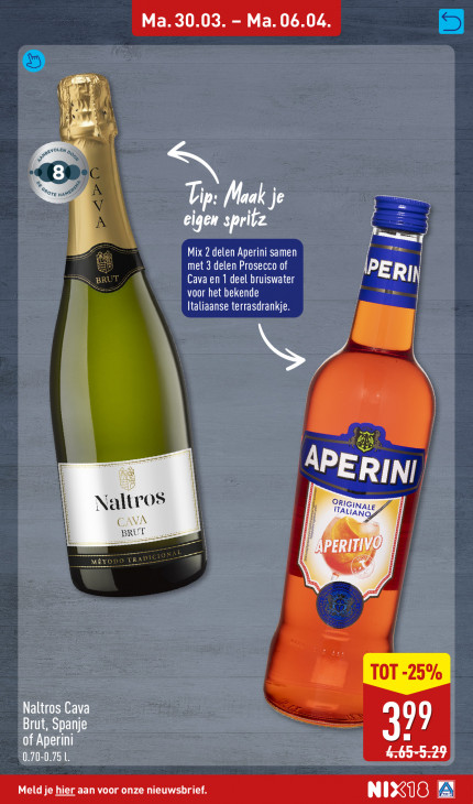 Deze tekst wordt automatisch gegenereerd, dus deze kan fouten bevatten.(à Di ei) genOLEN, x ore a T N ip: Maak Je N > 12 = eigen spri == D Mix 2 delen Aperini samen LEA NE Cava en 1 deel bruiswater IPERI MUC „Er Italiaanse terrasdrankje. Es zt SG \ DE 47 | AP ANN ze 2 OR IGINA Naltı ‚02 TALIAN 927 BRU Be | ze de IR Naltros Cava Brut, Spanje ENT 0.70-0.75 L.
