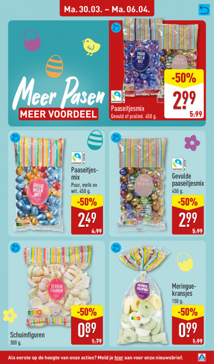 Deze tekst wordt automatisch gegenereerd, dus deze kan fouten bevatten.| | Il A, en lij Fe 50% 99 Meer RP Paaseitjesmix 2 MEER VOORDEEL Gevuld of praliné. 450 g El Let | FAIRTRADE | > | Paaseitjes =. FAIRTRADE | > MIX 28 Gevulde B DE a | ju Puur, melk en I paaseitjesmix wit. 450 g. 450 9. ON 7 à -50% TT | es ur 10 |. GLEN ll De ep EN RT N Ce Meringue IC) Dre De kransjes 1509 26 ; 4-5 0% 50% 24e js | 2) Schuimfiguren +” 09 3009 enn | Als eerste op de hoogte van onze acties? Meld je hier aan voor onze nieuwsbrief