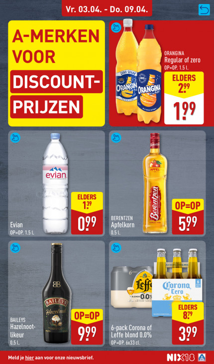 Deze tekst wordt automatisch gegenereerd, dus deze kan fouten bevatten.Vr. 03.04. - Do. 09.04. jan A-MERKEN ORANGINA VOOR Regular of zero 8 RS D ISCOUNT- ELDERS QT 27 PRIJZEN ed RIJZEN 99 a LE) AA APFEL evian | N oP Le BERENTZEN SJ OP=0P. 1.5 L. Evian 09 Apfelkorn 0.51 AT m m 2 6 el Ts dn L 4 Jeff 1 A5 ELDERS AQU OP 87 BAILEYS Hazelnoot- 6-pack Corona of likeur 099 Leffe blond 0.0% 299 (RAS OP=OP. 6x33 cl. Meld je hier aan voor onze nieuwsbrief. D LPS