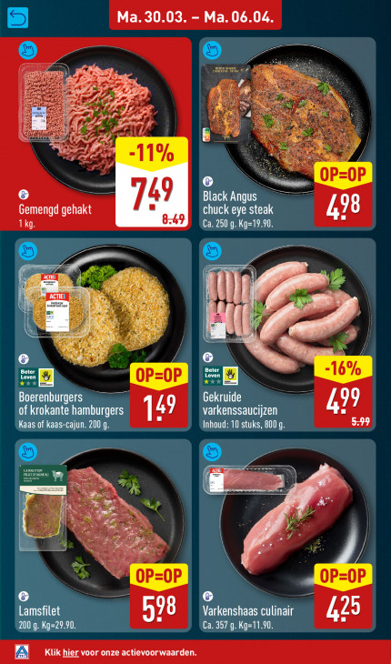 Deze tekst wordt automatisch gegenereerd, dus deze kan fouten bevatten.Ma. 30.03. - Ma. 06.04 BE B EA Br f nn ul Pe da -11% OP oP a = 49 Black Angus Gemengd gehakt chuck eye steak vl 1kg Ca. 250 g. Kg=19.90 As (7 = I = À Beter pass -1 6% kkX Leven LOP=0P hid. ee Boerenburgers Gekruide 99 =; of krokante hamburgers (2 varkenssaucijzen Kaas of kaas-cajun. 200 g. Inhoud: 10 stuks, 800 g en ENV EL Er LET DAGNEAU Le Ze de, TÜR k nd N | = À j "m | 7 B + OP=OP Lamsfilet Varkenshaas culinair AT FE 200 g. Kg=29.90 Ca. 357 g. Kg=11.90 Klik hier voor onze actievoorwaarden
