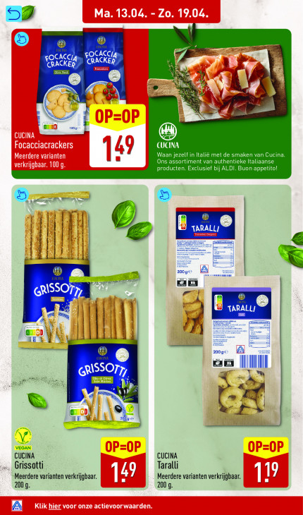 Deze tekst wordt automatisch gegenereerd, dus deze kan fouten bevatten.o & FOCACCIA RT CRACKER a s S > (ATEN Waan jezelf in Italië met de smaken van Cucina. 149 Ons assortiment van authentieke Italiaanse producten. Exclusief bij ALDI. Buon appetito! EN mnt ARALL Ce | | derde | ® 20 Aer Ca AU TARALL/ 9 | | | | Á a (Hi) pISSOr7, « À » le j « Tm 2009 (ive: eef 4 ER > Y. VEGAN CUCINA CUCINA Grissotti Taralli “Meerdere varianten verkrijgbaar. 149 Meerdere varianten verkrijgbaar. 119 9 9 A