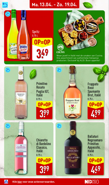 Deze tekst wordt automatisch gegenereerd, dus deze kan fouten bevatten.pe puce CR hi EN = JA #7 à ei ch mono EI Ms per 7 Yen 94 (ANA "+ Waan jezelf in Italië met de smaken van Cucina. > Ons assortiment van authentieke Italiaanse producten. Exclusief bij ALDI. Buon appetito! EN 7 : 7 JMANTE BI Es Primitivo Frappato Rosato Rosé Puglia IGT, Spumante EN Italië Brut, Italië 0.751. 0.751. MIA 76 Frappato Rose SPUMANTE BRUT nV TALIA u | 11 k ll 7 al INN, an L = ga Ballaturi Chiaretto Negroamaro di Bardolino Primitivo Classico, Appassite, Italië It} Italië ALA 0.751. 0.751. UT à == = 7 399 L |