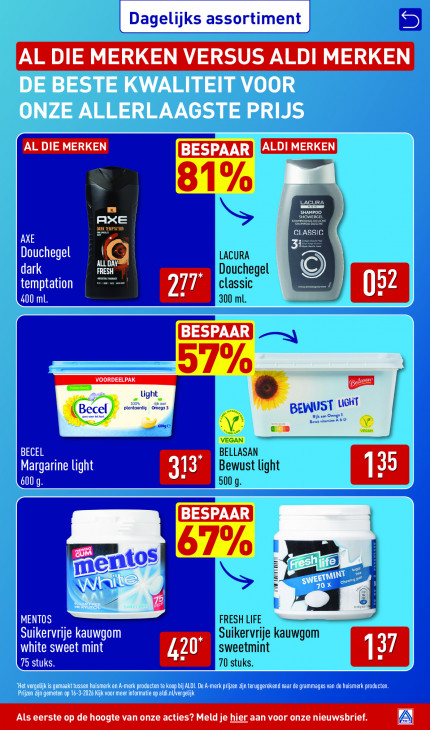 Deze tekst wordt automatisch gegenereerd, dus deze kan fouten bevatten.BESPAAR SLI u LACURA ee pa AXE CLASSIC RR! Se LACURA hir classic Douchegel CS ©) 300 ml. BESPAAR VOORDEELPAK 7 ad x ac VEGAN BELLASAN Bewust light Ei 500 9. 1 BESPAAR | LT LIU Kg FRESH LIFE 33 Suikervrije kauwgom sweetmint 37 70 stuks. Als eerste op de hoogte van onze acties? Meld je hier aan voor onze nieuwsbrief. A