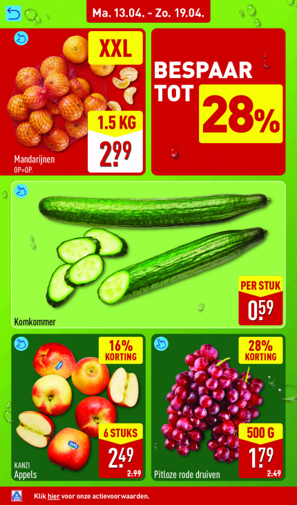 Deze tekst wordt automatisch gegenereerd, dus deze kan fouten bevatten.Ma. 13.04. - Zo. 19.04 in BESPAAR LC TOT ke \ Mandarijnen 27 299 ll a NE nn Ee cd a oe Ee pe he BR a el d A 59 «fi OR 2 dE 3 c* wat Ip EN Oi 2 Ad} 6 he ee Ir: KANZI 249 CE 19 Appels (TL Pitloze rode druiven A Klik hier voor onze actievoorwaarden