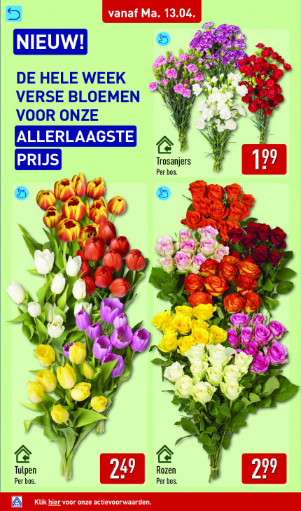 Deze tekst wordt automatisch gegenereerd, dus deze kan fouten bevatten.5 DE HELE WEEK if VERSE BLOEMEN À 5 AN \ #1 VOOR ONZE >, @ PRIJS Trosanjers [ kh Per bos. alg Vie Mo >= RA LA ; AT je nl 4) À re Ned F. Ë KO) ï + vn à N 5 7 fe 7 (8 3 à # LA PU 4 LYS = (3 @ nr @ @ Tulpen Rozen 2 T) Per bos. 25 Per bos.