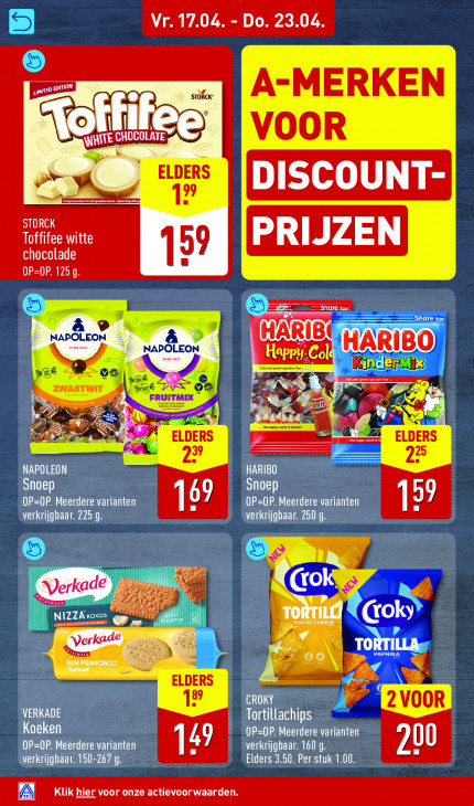 Deze tekst wordt automatisch gegenereerd, dus deze kan fouten bevatten.Vr. 17.04. - Do. 23.04. sròkac A-MERKEN @ | f 5 Tae VOOR yy ELDERS 1? STORCK Toffifee witte RIJZEN chocolade 15 PAND à & : Share see share — ARIB cen Happ Col HARIBO | Kind $Œ8 0% ZWARTWIT ga LE) UITMI AR! "ELDERS ELDERS ER. 39 —— 2> NAPOLEON HARIBO Snoep Snoep OP=OP. Meerdere varianten 69 OP=0P. Meerdere varianten verkrijgbaar. 225 9. verkrijgbaar. 250 9. 12 & 2 ar Guss Verkade IS LS DATES (0 erkade LLA 3 DT N ELDERS FA 15 CROKY VERKADE Tortillachips Koeken OP=OP. Meerdere varianten OP=0P. Meerdere varianten 1? verkrijgbaar. 160 g. 200 verkrijgbaar. 150-267 g. Elders 3.50. Per stuk 1.00. A Klik hier voor onze actievoorwaarden.