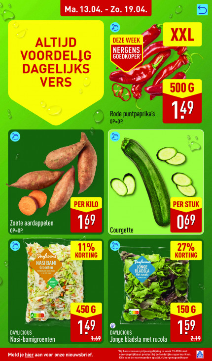 Deze tekst wordt automatisch gegenereerd, dus deze kan fouten bevatten.Ma. 13.04. - Zo. 19.04 Le © 7 NERGENS 72 CUS AT Up 5 Ye 7 ss v + N u 14 PE 4 Pe @Ÿ fj a Zoete aardappelen 169 6 OP=OP. HSE x ZA © = 3 >> — EG NASI BAMI Dn y à CRE Groenten ER N LS } rs 7 SA & x 4 x 4 + 2 à D. LE 7? =, Pd 2% 7 Ors, EB. DAYLICIOUS 1: DA TRTATNTES b9 Nasi-bamigroenten 077 Jonge bladsla met rucola Op basis van een prijsvergelijking in week 13-2026 met een vergelijkbaar product bij de landelijke supermarkten Meld je hier aan voor onze nieuwsbrief. Kijk voor de voorwaarden op aldi.nl/nergensgoedkoper A