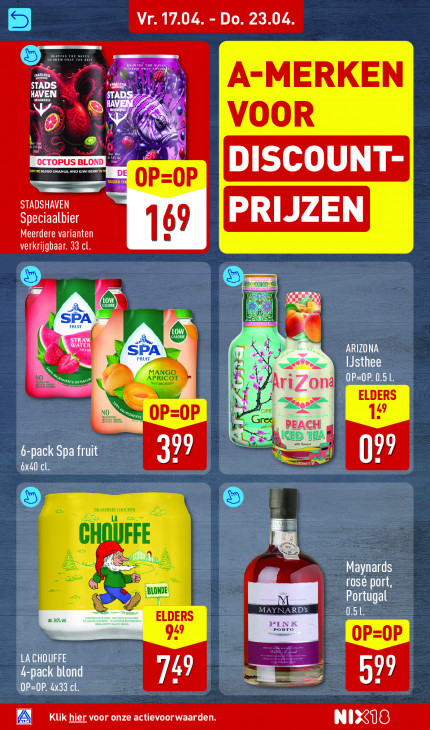 Deze tekst wordt automatisch gegenereerd, dus deze kan fouten bevatten.Vr. 17.04. - Do. 23.04. ©: - PUS à ne X A-MERKEN HAVEN STA N No 8 Mu VOOR w \ NZ kl DE DISCOUNT- KEE OP OP STADSHAVEN Speciaalbier PRIJZEN Meerdere varianten 69 verkrijgbaar. 33 cl. >) nd SPA FRUIT WATER STRAW À 5 SPA FRUIT Ve ARIZONA 1) TS IJsthee OP=0P. 0.5 L. SE AlriZoni D a CR. IL nn OP oP EC ALES 6-pack Spa fruit 99 2 6x4 cl. UT 07° LA PA FFE Maynards rosé port, BLONDE Portugal MAYNARD'S E78 ac.B0% vol ELDERS PI 92 LA CHOUFFE 4-pack blond 7» 5 — 1 EL OP=0P. 4x33 cl. Klik hier voor onze actievoorwaarden LINS
