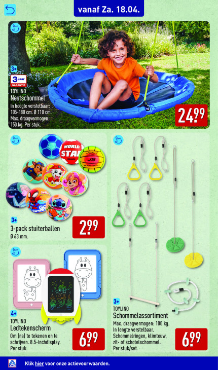 Deze tekst wordt automatisch gegenereerd, dus deze kan fouten bevatten.fu 14 Ÿ Y de < GARANTIE BA Nestschommel 5 Be | In hoogte verstelbaar: : LEDER EIER Max. draagvermogen: > az 2499 150.kg. Per stuk. CI] > À url er 5 | € af Ser 3-pack stuiterballen ÿ 63 mm. pa © ° & % : an eo? \ ve 2 ( D) D ?) e- > (© o| N a = ——— TOYLINO Schommelassortiment à TOYLINO Max. draagvermogen: 100 kg. Ledtekenscherm In Lengte verstelbaar. Om (na) te tekenen en te Schommelringen, klimtouw, zit- of schotelschommel. schrijven. 8.5-inchdisplay. Per stuk. Per stuk/set.