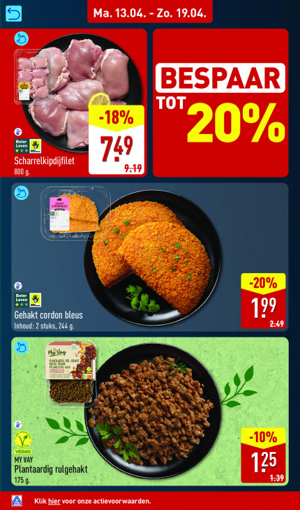 Deze tekst wordt automatisch gegenereerd, dus deze kan fouten bevatten.Ma. 13.04. - Zo. 19.04. pe à pe BF ein def Wr ESP AAR I -18% Beter TOT 0% Leven kkX nn 49 Scharrelkipdijfil et Een 919 D OE € hed Beter Le Leven A Gehakt cordon bleus Inhoud: 2 stuks, 244 g. 19° Me AUL GEHAK es ù ICHE HACK ve LT ED N min Ge ms, -10% MY VAY Plantaardig rulgehakt DER 12 1759. Klik hier voor onze actievoorwaarden.