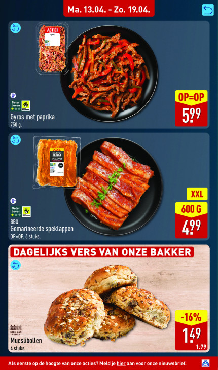 Deze tekst wordt automatisch gegenereerd, dus deze kan fouten bevatten.Ma. 13.04. - Zo. 19.04. LU | [ NS: ® Beter Leven XX Em Gyros met paprika LA 57 7509. Te LE UN 5 2 BBQ ze SPEKLAPPEN | Pea | Es à SB 5 Ei SN LOC TU es B Gemarineerde speklappen 49 OP=0P. 6 stuks. Zi de gees N 2 mas Se Mueslibollen 4 stuks. 8 Als eerste op de hoogte van onze acties? Meld je hier aan voor onze nieuwsbrief. A}
