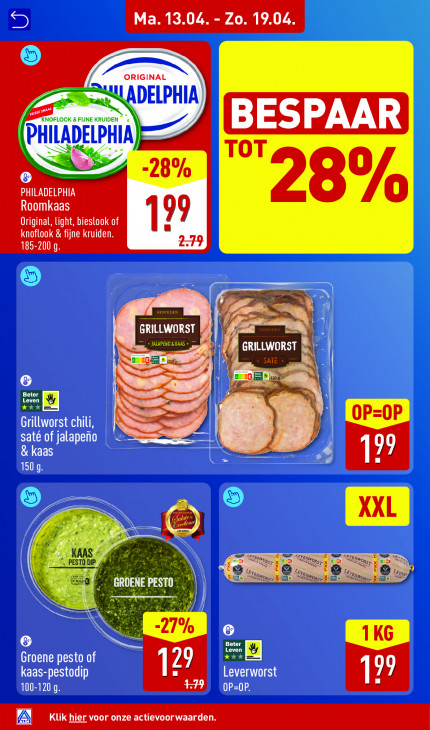 Deze tekst wordt automatisch gegenereerd, dus deze kan fouten bevatten.Ma. 13.04. - Zo. 19.04. SP \ \ EPA ESP VLS PHILADELPHIA = -2 8% PHILADELP MM Roomkaas TOT 8% Original, light, bieslook of 99 CT ETE TTET a W u ne m \ JALAPENO &KAAS + jen LWORS TE B Leve Bete: | = | Lee NS A Grillworst chili, SI OP=OP saté of jalapefio nn kaas 2) (EL 1509 1 KAAS Sr) k on KI NN Leveı ic Groene pesto of 29 XX kaas-pestodip Leverworst 17 {ap OP=OP. Klik hier voor onze actievoorwaarden.