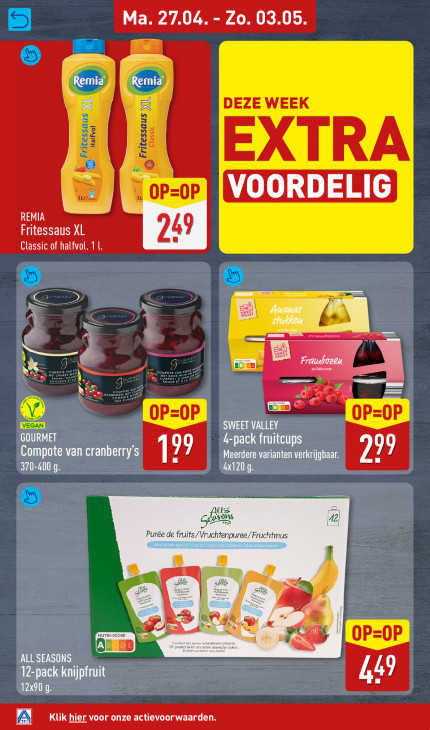 Deze tekst wordt automatisch gegenereerd, dus deze kan fouten bevatten.Ma. 27.04 - Zo. 03.05 Fe | a DEZE WEEK Fritessaus Classic © EXTRA + ; « OP=0P REMIA Fritessaus XL 49 Classic of halfvol. 1 = I a à RE | WE his = 4 = tr 3 sue ERN C7 en, Na Ps == oP oP oP SUR RNA NUE 4-pack fruitcups Compote van cranberry's 199 Meerdere varianten verkrijgbaar. 299 REN 4x120 9 een zie ass fe Purée de fruits/Vruchtenpuree/Fruchtmus fl » 0 OP=OP ALL SEASONS 12-pack knijpfruit 49 ACI Klik hier voor onze actievoorwaarden