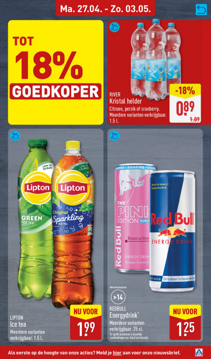 Deze tekst wordt automatisch gegenereerd, dus deze kan fouten bevatten.Ma. 27.04 - Zo. 03.05 PE eN en © (1 U En [a gx 2 18% _ es QUE 18% Kristal At Citroen, perzik of cranberry. 089 Meerdere varianten verkrijgbaar. (dll © LOW IN KON me SUGAR RL (ATEN OL.) LC CO Lipton : En LL: Original © DENG GREEN 1D} ON Bull ER CS Zn ] ENERG Pad ERGY DRINK z wleert Lichaam &f Red Bull RUE Stimuleert Lichaam ent Identificatieplicht D REDBULL LIPTON ME MO LS Icetea Meerdere varianten verkrijgbaar. 25 cl Meerdere varianten 199 Er geldt maximaal 4 dezelfde 125 verkrijgbaar. 1.5 L aanbiedingen per klant per bezoek. mn Als eerste op de hoogte van onze acties? Meld je hier aan voor onze nieuwsbrief.