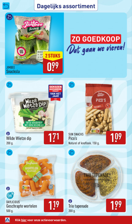 Deze tekst wordt automatisch gegenereerd, dus deze kan fouten bevatten.| Dagelijks assortiment | == Ne GE LE Snack ZO GOEDKOOP Je za SNACK (at gaan we vieren CES 2 STUKS ne 99 GEKOZEN 5 HUISMERK VAN HET Snaa Sur FT PICO'S LASA è 2 NATUREL Ter er AI nor. E Smeren dippen D ae A &x0p SUN SNACKS Wilde Wietze dip ico's 2009 Naturel of knoflook. 150 g a 9 € Er = Le 5 F ® le © PROOF, LANET we + DAYLICIOUS Geschrapte wortelen Trio tapenade 500 9 2009 A