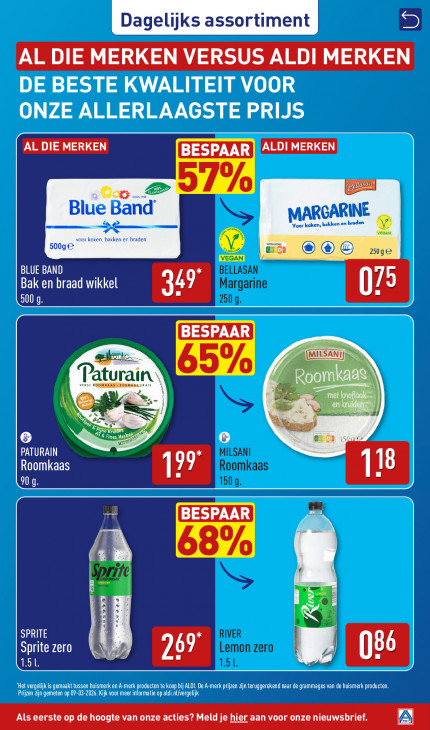 Deze tekst wordt automatisch gegenereerd, dus deze kan fouten bevatten.5 Dagelijks assortiment AL DIE MERKEN VERSUS ALDI MERKEN DE BESTE KWALITEIT VOOR ONZE ALLERLAAGSTE PRIJS Blue Band NARGARIE mn Voor koken, bekken en brad: kaken, bakk id 500g @ en a SE 250ge BLUE BAND Bak en braad wikkel 153 500 g ele turain Nr a 4 "op Am a PATURAIN Roomkaas U 9g EL SS BUN: Je) DZ Sprite zero hel | EX Het vergelijk is gemaakt tussen huismerk en A-merk producten te koop bij ALDI. De A-merk prijzen zijn teruggerekend naar de grammages van de huismerk producten. Prijzen zijn gemeten op 09-03-2026. Kijk voor meer informatie op aldi.nl/vergelijk