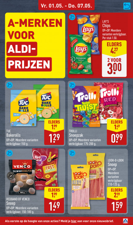Deze tekst wordt automatisch gegenereerd, dus deze kan fouten bevatten.Vr. 01.05. - Do. 07.05. Og LAY'S A-MERKEN Chips OP=0P. Meerdere Bun Kd varianten verkrijgbaar. VOOR Per stuk 1.50. SA € ELDERS 27 ALDI- ETS Bolognese Flavour 2 VOOR = PRIJZEN 2 ER u 00 | D ZI Li all AK R LLS alb, FLN BAKE 9 R LLS ik sour 7 ©, ELDERS ELDERS 99 in] 49 TUC LULU] Bakerolls Snoepzak OP=OP. Meerdere varianten 29 OP=OP. Meerdere varianten 99 verkrijgbaar 150 g. verkrijgbaar 175-200 g. Red and LOOK-0-L00K br Gal) VENCO LJ Snoep NIN ULDE (EU (ZACHTOZ4 LEE WW a varianten = verkrijgbaar Si renom Ens, = M 110-195 q. wos) (=) | e REDBAND OF VENCO = Snoep | OP=OP. Meerdere varianten 49 | a] LI verkrijgbaar. 150-180 g. Als eerste op de hoogte van onze acties? Meld je hier aan voor onze nieuwsbrief.