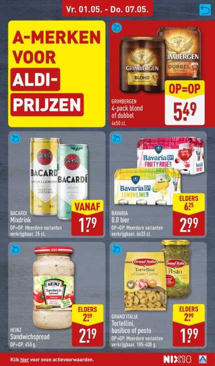 Deze tekst wordt automatisch gegenereerd, dus deze kan fouten bevatten.Vr. 01.05. - Do. 07.05. A-MERKEN Du: PD, GEN VOOR — ei GRI GEN ai u ALDI- OP OP GRIMBERGEN PRIJZEN 4-pack blond of dubbel 49 ce ETET op? 3 avarl ® FRUIT Y ROSÉ haa » ame BACAR ul steno BACARDI ah Bavaria & TL \l ELDERS ul Hoi Sul ) VANAF 67 BACARDI BAVARIA Mixdrink 0.0 bier OP=OP. Meerdere varianten Ik OP=OP. Meerdere varianten verkrijgbaar. 25 cl. verkrijgbaar. 6x33 cl. 1 eN ee © — Wel lia, Grand Italia) rtellini Pe all 0 Carne os Me Oy y li 2% ELDERS are ELDERS GRAND'ITALIA 2? 27 Tortellini, HEINZ — basilico of pesto Sandwichspread 21 OP=OP. Meerdere varianten 17 OP=OP. 450g. verkrijgbaar. 185-400 g. Klik hier voor onze actievoorwaarden. LIS)