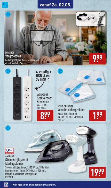 Deze tekst wordt automatisch gegenereerd, dus deze kan fouten bevatten.r B 4 IA | Hi . u 1 \ 4 MAGINON \ + Vergrootglas 8 99 Ledvergrootglas, beeldsc 1 WAE TE“ dla 4-voudig + 5 USB-A en 2x USB-C „Ie WORKZONE Stekkerdoos 3 de Kabellengte ca. 1.4 m. Per stuk. HOME CREATION Vacuüm opbergzakken 2x ca. 60x100 cm of ca. 80x110 cm + 70x80 cm. 71 Hea E [ Per set. > = EP Zyaar ] F2 © er AMBIANO fo TS FL Stoomstrijkijzer of kledingstomer Stoomstrijkijzer (max. 2400 W‚ ca. 350 ml) of kledingstomer (max. 1470 W, ca. 120 ml). Meerdere varianten verkrijgbaar. KT Per stuk. Klik hier voor onze actievoorwaarden.