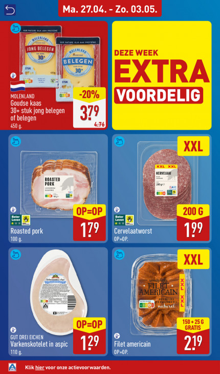 Deze tekst wordt automatisch gegenereerd, dus deze kan fouten bevatten.Ma. 27.04. - Zo. 03.05 > WE vor son QLENLAy, DEZE WEEK BEL 1e STUK 450g Œ sm EXTRA 450 MOLENLAND ax 03 -2 0% Goudse kaas 30+ stuk jong of belegen 979 4509 u nn Ne me En x» XL Le LAAT ROASTED ge BAT 4 si BY Beter m OP OP KH Beter Leven Leven F1 | Roasted pork 179 Cervelaatworst 99 1009 OP=0P. XXL Wi à | is waturel il 150 + 25 G OP=OP ee GRATIS GUT DREI EICHEN Varkenskotelet in aspic 129 Filet americain 19 Ur (ES Klik hier voor onze actievoorwaarden