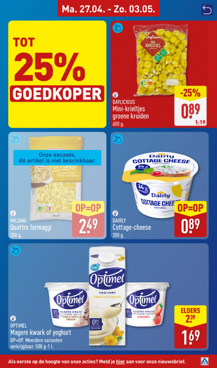 Deze tekst wordt automatisch gegenereerd, dus deze kan fouten bevatten.Ma. 27.04. - Zo. 03.05. elden ES PAT MINI ES | Ne TTS GOEDKOPER) e REE DAYLICIOUS Mini-krieltjes 89 groene kruiden ngen m4 05? Cs 7 VANILLESMAAK YOGHURT À # TO AARDBEI +] 00 00
