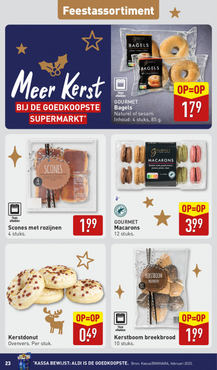 Deze tekst wordt automatisch gegenereerd, dus deze kan fouten bevatten.a‘ A ; I; BAGEL * Dn A =" GEL A afbakl GOUR Meer Kerst Bagels 19 Naturel of sesam. | Inhoud: 4 stuks, 85 g. [a z OURMET > , & zi | MAEARONS in 3 a ge mm arden = © GOURMET Ee Scones met rozijnen Macarons 77 4 stuks. | LL 12 stuks. nl x hr Ge 7 À is MU) L > Pal if I) se? se in ! 4 16, | % zus M arten Kerstdonut LÉ 7 Kerstboom breekbrood | 199 Ovenvers. Per stuk. 10 stuks. 23 “KASSA BEWIJST: ALDI IS DE GOEDKOOPSTE. Bron: Kassa/BNNVARA, februari 2025.