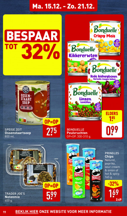 Deze tekst wordt automatisch gegenereerd, dus deze kan fouten bevatten.Ma. 15.12 = Zo. 21.12 Bonduelle \ Lan Mn mn A Bonduelle u 220, rene) gd 6 ER: onduelle : Rode kidneybonen 4 Haricots rouges kidney, ng ur m KAN Ki TA 0SSEN- onduelle LS STAART N Linzen % | S0EP ji DA & Lentilles id va hd 2 LA) À ELDERS 155 800 mL OP oP SPEISE ZEIT BONDUELLE Ossenstaartsoep 75 Peulvruchten 09 800 ml OP=OP. 300-310 g u je PRINGLES r 5 il Chips Naturel il paprika ES DRING sour cream OT) + & onion of N Cr hot & spicy. 165g æ: = AL ni HOT & SPICY OP=0P € TRADER JOE'S Er re Notenmix 1599 É a ä 169 100g Lu BEKIJK HIER ONZE WEBSITE VOOR MEER INFORMATIE