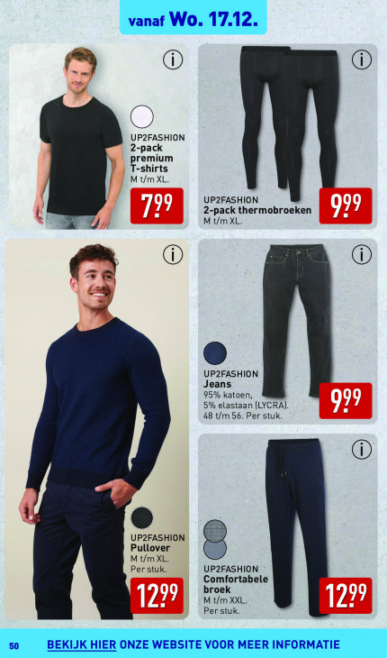 Deze tekst wordt automatisch gegenereerd, dus deze kan fouten bevatten.UP2FASHION 2-pack premium T-shirts M t/m XL. UP2FASHION 2-pack thermobroeken { M t/m XL. ( @ UP2FASHION Jeans 95% katoen, 5% elastaan [LYCRA] 48 t/m 56. Per stuk. Hd Pr L fi) UP2FASHION ei SELS Pullover M t/m XL. Per stuk. UP2FASHION Comfortabele broek | M t/m XXL. 127 Per stuk.