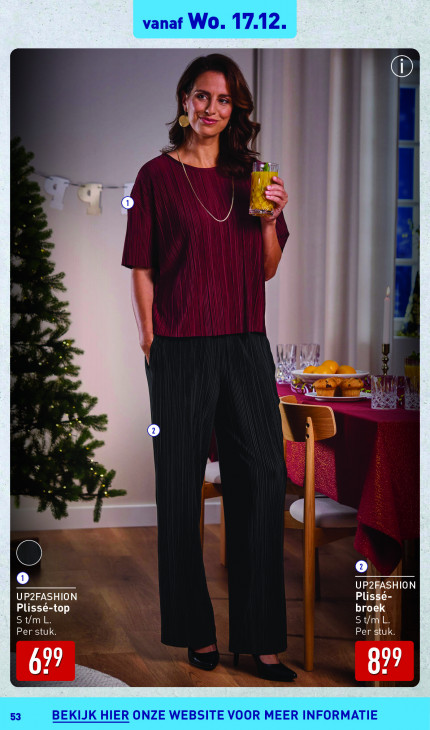 Deze tekst wordt automatisch gegenereerd, dus deze kan fouten bevatten.vanaf Wo. 17.12. A EL à À (d m Pa L: Br 4 a+ N + vw; qe UP2FASHION OI CLIN Plissé- Plissé-top broëk S t/m L. Per stuk. St/mL. Per stuk. 87 09 53 BEKIJK HIER ONZE WEBSITE VOOR MEER INFORMATIE