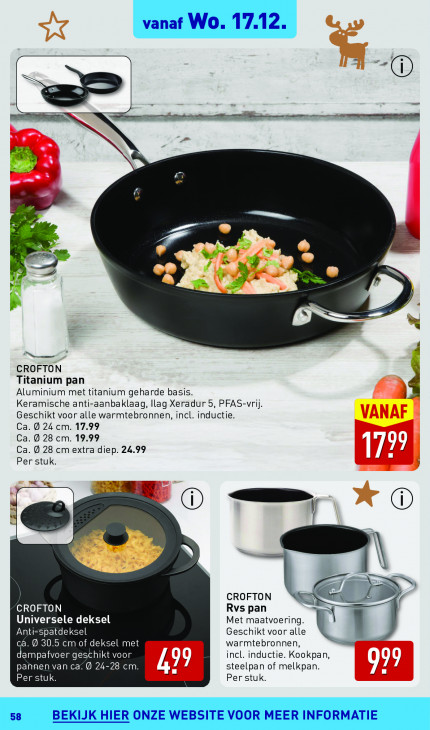 Deze tekst wordt automatisch gegenereerd, dus deze kan fouten bevatten.vanaf Wo. 17.12. © eee \é 8 5: 4 f € * > Va Zu + À Ne CROFTON Titanium pan Aluminium met titanium geharde basis. 4 À Keramische anti-aanbaklaag, Ilag Xeradur 5, PFAS-vrij. Geschikt voor alle warmtebronnen, incl. inductie. VANAF Ca. 9 24 cm. 17.99 Ca. 9 28 cm. 19.99 Ca. 9 28 cm extra diep. 24.99 Per stuk. u a henk X © \ ES, PT CROFTON x L CROFTON Rvs pan Universele deksel Met maatvoering. Tv Geschikt voor alle Antisspatdeksel câ. 30.5 cm of deksel met warmtebronnen, dampafvoer geschikt voor inel. inductie. Kookpan, pannen van ca‘ ® 24-28 cm. LES steelpan of melkpan. Per stuk. Per stuk. 58 BEKIJK HIER ONZE WEBSITE VOOR MEER INFORMATIE