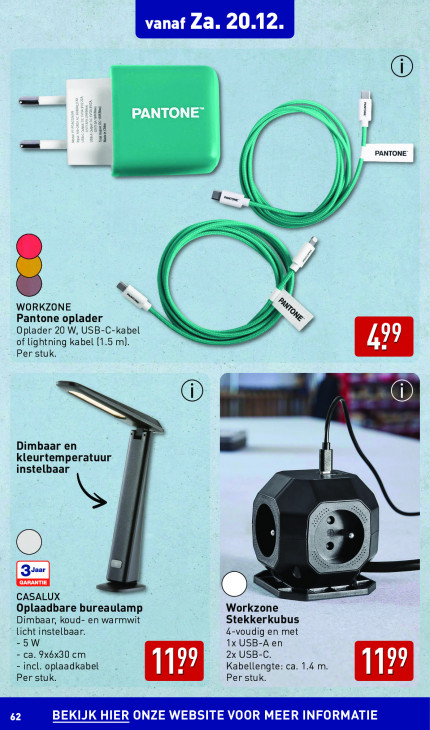 Deze tekst wordt automatisch gegenereerd, dus deze kan fouten bevatten.PANTONE 3 i PANTONE | | B. $ WORKZONE Pantone oplader % Oplader 20 W, USB-C-kabel of Lightning kabel (1.5 m). Per stuk. Dimbaar en kleurtemperatuur an instelbaar e ® CASALUX Oplaadbare bureaulamp Workzone Dimbaar, koud- en warmwit Stekkerkubus licht instelbaar. 4-voudig en met -5W 1x USB-Aen - ca. 9x6x30 cm 2x USB-C. - incl. oplaadkabel Kabellengte: ca. 1.4 m. Per stuk. dE Per stuk. QT