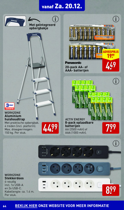 Deze tekst wordt automatisch gegenereerd, dus deze kan fouten bevatten.LA WH mmm Met geïntegreerd Or LE ED see = AA | | PROTE 10 | Ans TE | | man en ÿl LE Hi PD PR |! i E | | Panasonic 49 20-pack AA- of AAA- batterijen F | | ca +] + ' AA, AAA AAA| | AA, \ x IS AA | VAN VAR VX Dd KL 4e AAl| AA FE à Er IS [3 KE WORKZONE we? & Aluminium huishoudtrap u ACTIV ENERGY Met praktische opbergbak. 8-pack oplaadbare 4 treden (incl. platform). batterijen Max. draagvermogen: AA (2500 mAh) of I 150 kg. Per stuk. AAA (1000 mAh). m WORKZONE Stekkerdoos 4-voudig incl. 1x USB-A 5 en 2x USB-C. 99 5 Kabellengte: ca. 1.4 m. Ki Per stuk.