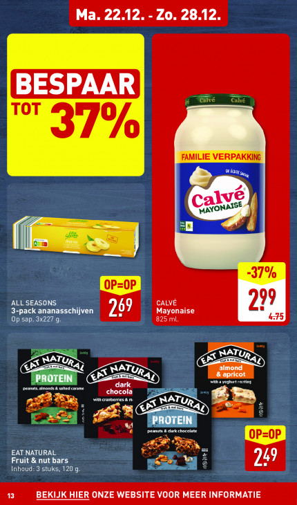 Deze tekst wordt automatisch gegenereerd, dus deze kan fouten bevatten.Ma. 22.12. - Zo. 28.12 nun jé Lo Calvé | u am 0 FAMILIE VERPAKKING 1.3077; Sy se Ca ONAÏ de ie PJ -3 1% OP oP ALL SEASONS CALVE 99 3-pack ananasschijven 69 825 ml Mayonaise Op sap. 3x227 g Ren Á ET NATU, mla 32 EEE NUR br Ra 15 ST ús almond Nn 4 with a yoghurt rosting & apricot peanuts, almonds & salted carame dark UNE CCE LL chocola Bet LATE ER Ed NAT Up ver ER LS + 5 = Teoit & nut b; u A 2 ns Lo) Peanuts & dark chocolate Rx OP oP Er ER F2 Ge EAT NATURAL ? Fruit & nut bars = 49 Inhoud:3 stuks, 120 g oùe LE BEKIJK HIER ONZE WEBSITE VOOR MEER INFORMATIE