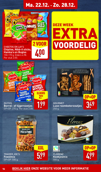 Deze tekst wordt automatisch gegenereerd, dus deze kan fouten bevatten.Ma. 22.12. - Zo. 28.12 AT an & lays) [EM CE DEZE WEEK (43 Sn "A LE yat exc SS 0 EXTRA Voo CHEETOS EN LAY'S Chipitos, Nibb-it sticks Hamka’s en Bugles 150-170 g. Elders 4.98 00 Per stuk 2.00 Ke GD OURMET _ N QU À fis) Á CE 7 AE gore ? Cache SD 3 | 2759 f wd ons ELDERS € RiKA er 2? OP OP 275g = (an) DUYVIS — GOURMET Borrel- of tijgernootjes Luxe roomboterzoutjes OP=OP. 275 g. Per stuk 2.00 199 A 349 Li — 10 ae Den CA I 2 fi TRADER JOE'S ED ur SA PS Er 7 KT EO tn op TRADER JOE'S FLORENZ Feestmix ST) Koekjesmix 499 OP=OP. 500 g Te 16 BEKIJK HIER ONZE WEBSITE VOOR MEER INFORMATIE
