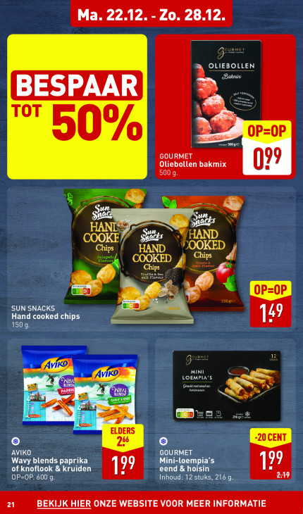 Deze tekst wordt automatisch gegenereerd, dus deze kan fouten bevatten.Ma. 22.12. - Zo. 28.12 URMET el OLIEBOLLEN cBakmix Ki A OP OP u 60% ms 500 9 € GOURMET 99 Oliebollen bakmix lolo X hj es — ® re © HAND COOKE VOOKED Es Chips Chips P Bor COOKED (ei) OEREN Murn-sconE GGD OP 4 TA SUN SNACKS Hand cooked chips | nn 49 150g B Avi) 4 U LOEMPIA’S MINI QT BLENDSE En = PAPRIK 7m RS u Dee) ET ELDERS 2 AVIK GOURMET Wavy blends paprika Mini-loempia’s of knoflook & kruiden 199 eend & hoisin OP=OP. 600 g Inhoud: 12 stuks, 216 g El 21 BEKIJK HIER ONZE WEBSITE VOOR MEER INFORMATIE