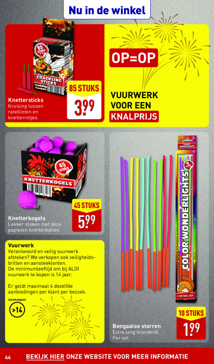 Deze tekst wordt automatisch gegenereerd, dus deze kan fouten bevatten.Nu in = zt de winkel & A / 1 — DN \v 7/1 N —ù ZN y \ 7 mn A à Je — 2 D mn" ZINN Er / // Wa | // Em l 1] I VUURWERK | 8 VOOR EEN a 77 sr Re al SB EE N | N KNETT | JW DIA, SGELS | ré | | Mi] Dre N x 5 A 5 | = Knetterkogels pat 2 Lekker stoken met deze NH 1 papieren knetterballen. B Vuurwerk | ï Verantwoord en veilig vuurwerk afsteken? We verkopen ook veiligheids- LOR:WONDER brillen en aansteeklonten. O U De minimumleeftijd om bij ALDI (a LÉ ÈS vuurwerk te kopen is 14 jaar. ll — ar Er geldt maximaal 4 dezelfde 5 $) aanbiedingen per klant per bezoek. Identificatieplicht > li NA — € ©) 41 / ZN L = = Bengaalse sterren N Extra lang brandend. | 1 1 \ Per set.