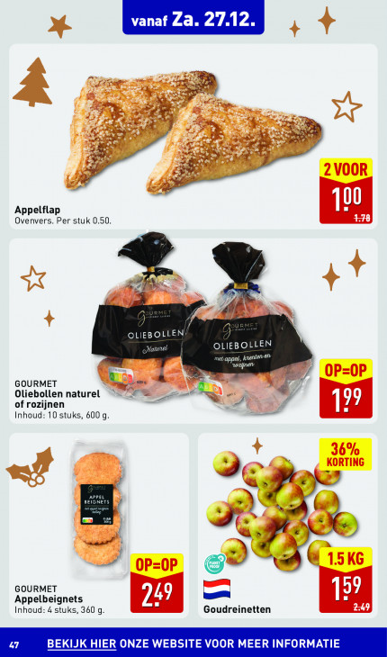 Deze tekst wordt automatisch gegenereerd, dus deze kan fouten bevatten.2 a * > x N à à # FAR Du > = mn Der | hi Appelflap Ovenvers. Per stuk 0.50. det PR we 9 OLIEBOLLE Natımeb OLIEBOLLEN er anne, ana en 7 GOURMET im % Oliebollen naturel 600 G I’ of rozijnen Inhoud: 10 stuks, 600 g. [ + Pre Kate 1 ) Je | EE I: Ne mart w GOURMET = 7 Appelbeignets ul / 19 | Inhoud: 4 stuks, 360 g. Goudreinetten