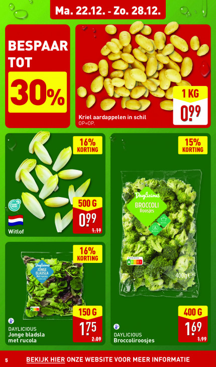 Deze tekst wordt automatisch gegenereerd, dus deze kan fouten bevatten.Ma. 22.12. - Zo. 28.12 ”3 A „® ne BESPAAR el 3 3 CC 8 TOT DE" ‚® r ES < r Se 2 Al ed df u Kriel aardappelen in schil OP=OP. „Jr ER PDT nz CLR] Roosjes N ii 99 Witlof Al eh je) 7 2 7 7 Ge / ” ER 0m ÈS Ve B 7, 7 IN B: Ennn nn Dt = x Po m) Ex DAYLICIOUS 69 Jonge bladsla [ES DAYLICIOUS met rucola Broccoliroosjes 5 BEKIJK HIER ONZE WEBSITE VOOR MEER INFORMATIE