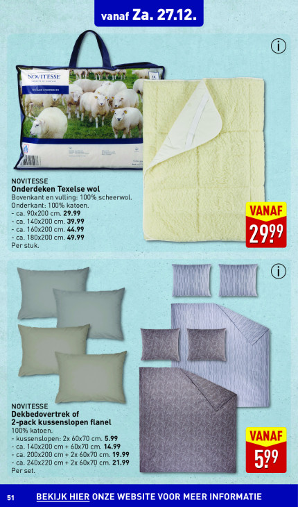 Deze tekst wordt automatisch gegenereerd, dus deze kan fouten bevatten.vanaf Za. 27.12. ir a 1x NC IV 1 ‚| Etn nd 1,2 1 ! À | vf à Ne er Al ee 3 4 Al N | N ES A NOVITESSE Onderdeken Texelse wol 7: Bovenkant en vulling: 100% scheerwol Onderkant: 100% katoen. Li - ca. 90x200 cm. 29.99 ses - ca. 140x200 cm. 39.99 - ca. 160x200 cm. 44.99 AS - ca. 180x200 cm. 49.99 2 Per stuk. II man | AN) D ALM UDAUD) | KNOL IN | 7? I 4 I! X f a I NOVITESSE Dekbedovertrek of 2-pack kussenslopen flanel 100% katoen. - kussenslopen: 2x 60x70 cm. 5.99 - ca. 140x200 cm + 60x70 cm. 14.99 - ca. 200x200 cm + 2x 60x70 cm. 19.99 - ca. 240x220 cm + 2x 60x70 cm. 21.99 Per set. El EKIJK HIER ONZE WEBSITE VOOR MEER INFORMATIE