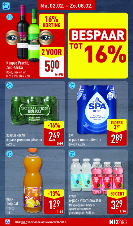 Deze tekst wordt automatisch gegenereerd, dus deze kan fouten bevatten.Ma. 02.02. - Zo. 08.02. i 6% KORTING 7+ ESP WEN ; 8 a 2 VOOR 74 6° Zuid-Afrika Kaapse Pracht, 00 Rood, rosé en wit. 0.75 L. Per stuk 2.50. u jE ON THE Pi: GO TTA dg SPA | REINE ee) | NATURAL MIN VATER Au PILSENER a ee u on SCHULTENBRÄU D 2 6-pack premium pilsener 6-pack mineraalwater IT 6x33 cl. ESI = Ft dn 7‘ - Nl — ‘5 | LME 1 À L EL à TROPIC FRUIT: N QU Lan 6-pack vitaminewater fruits Tropical 12 Mango-guave, limoen- 15 lychee of framboos- 39 granaatappel. 6x50 cl. Klik hier voor onze actievoorwaarden. LENS